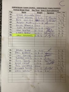 The overall match winner today was Ian “Speedy” Ward showing his Shrewsbury talent with a superb weight of 14-9-0 consisting of big perch,roach and dace.Second was Ian Hughes with 5-8-4 from peg 74 showing the class angler he is. Dave Feeney took third spot with 5-2-8 of small dace followed by Darren Frost in fourth with a weight of 4-8-4 consisting of a big chub.
